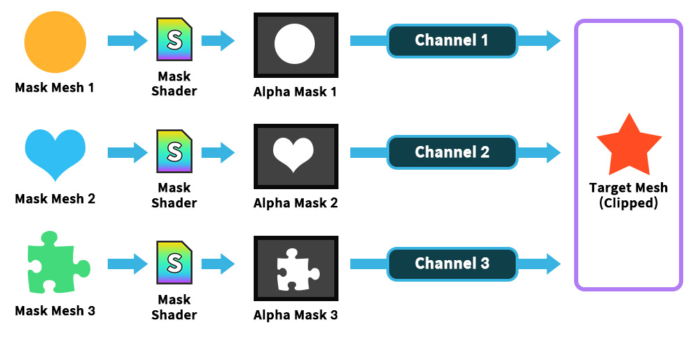 Thanks to this characteristic, it is possible for two or more mask meshes to clip the same mesh.