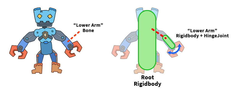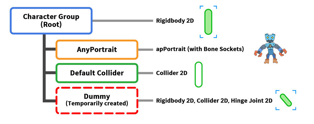 4. Dummy: This is a dummy object temporarily created when the ragdoll effect begins. It corresponds to a robotic arm and has physics components, including a "Hinge Joint 2D."