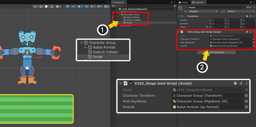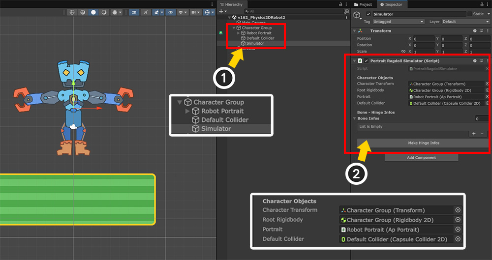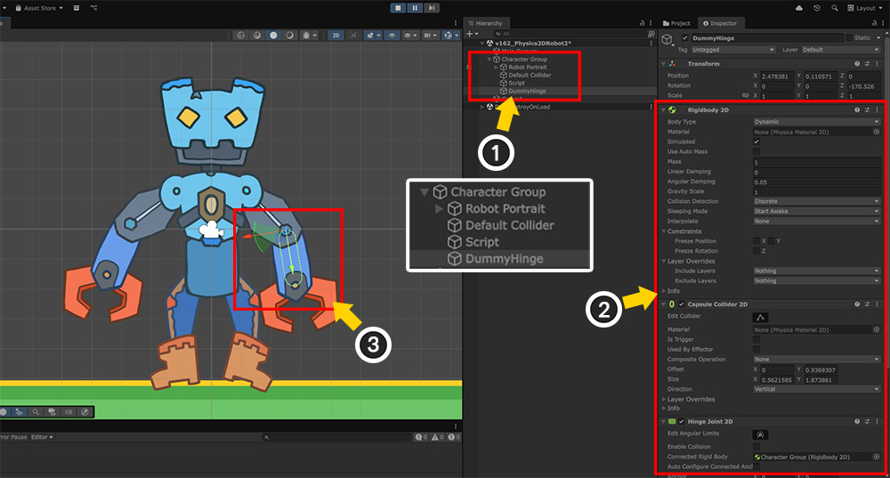 (2) This dummy object has the following components: "Rigidbody 2D," "Capsule Collider 2D," and "Hinge Joint 2D."