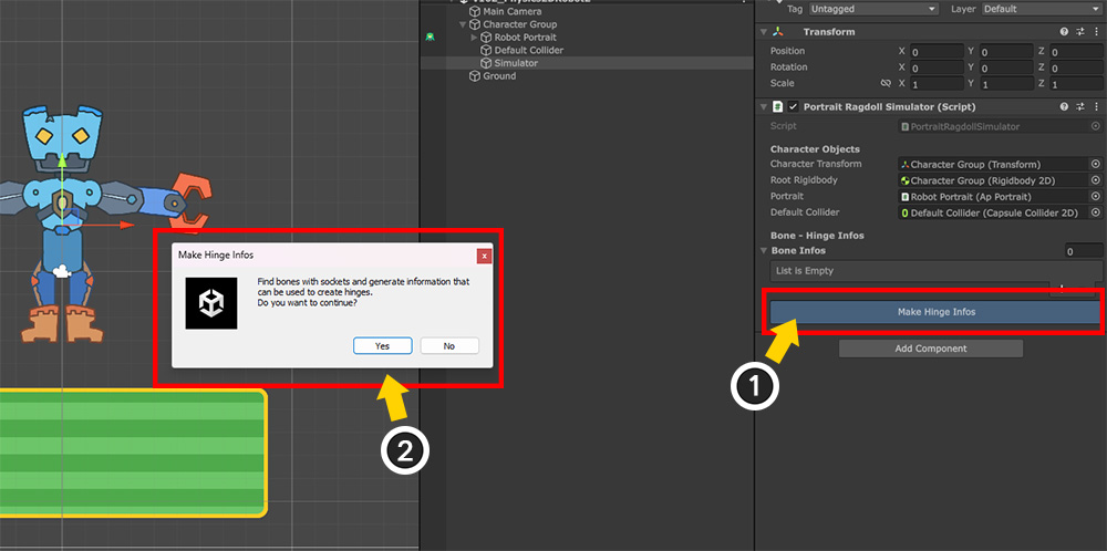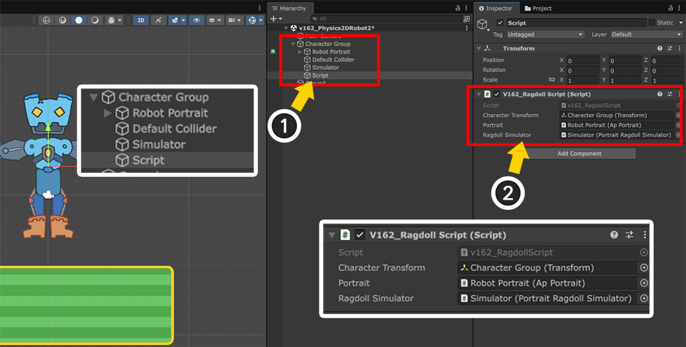 (2) Add the downloaded "Portrait Ragdoll Simulator" script to the created GameObject.