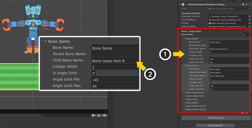 2. Parent Bone Name: The name of the parent bone to be connected as the parent of the "Hinge Joint 2D." If no parent bone is specified, it will be connected to the character's root object.