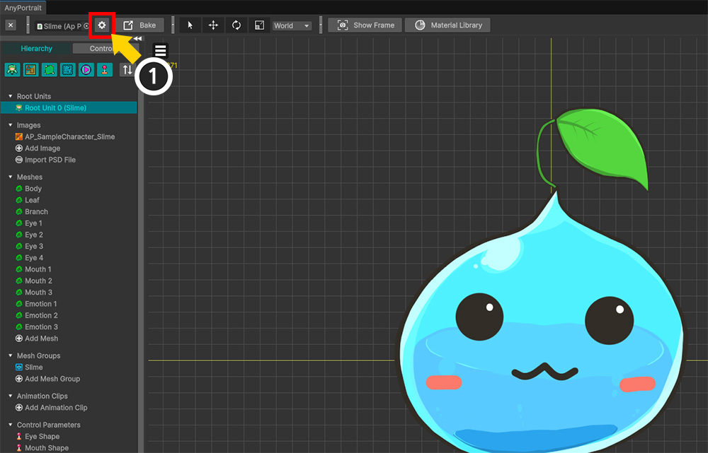 (1) AnyPortrait 에디터를 열고, 캐릭터가 선택된 상태에서 설정 버튼을 누릅니다.