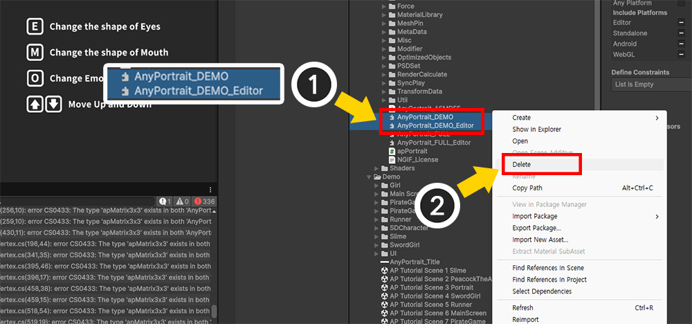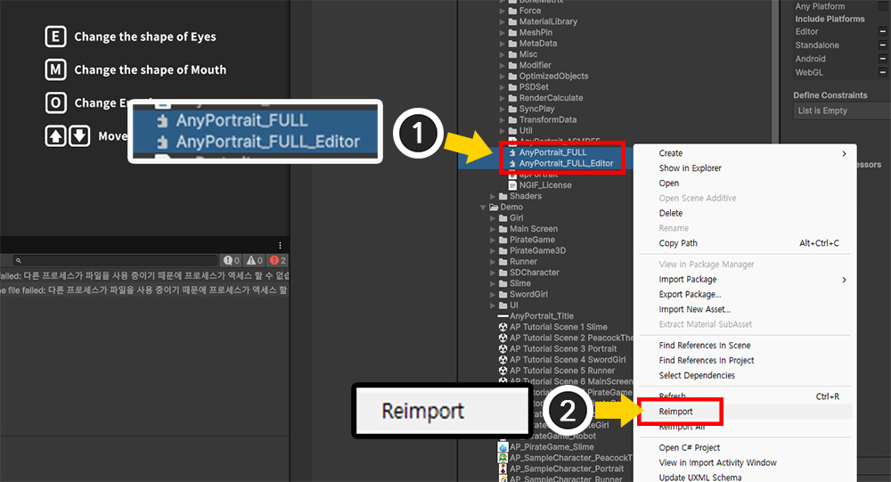 (1) 설치한 버전에 맞지 않는 두개의 DLL 파일들 ("AnyPortrait_DEMO, AnyPortrait_DEMO_Editor")를 선택합니다.