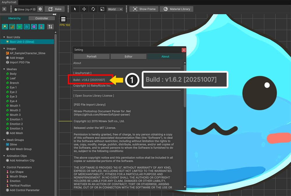 AnyPortrait 에디터에서는 현재 버전을 확인할 수 있는 몇가지 UI들이 있습니다.
